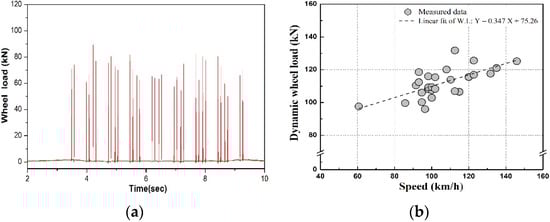 Measurements of dynamic responses of the track. (a) Example of dynamic-wheel-load waveforms; (b) Dynamic-wheel-load measurements with respect to the train speed.