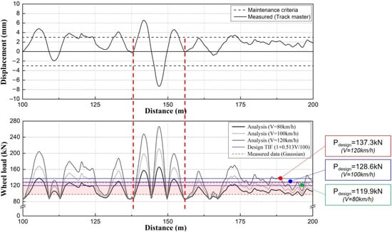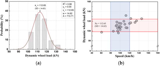 As shown in Figure 14 [17], to calculate the representative value of the dynamic wheel load of the ballasted track, the train speed was set to 80–120 km/h in consideration of the average train-operating-speed range of the target section of this study, and the dynamic-wheel-load data for the corresponding speed range was used and applied to a Gaussian probability-density-function analysis.