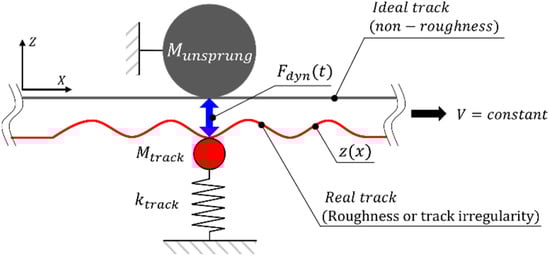 According to previous studies [2,3], the irregularity in the vertical direction of the rail surface in contact with the wheel increases the Wheel-Rail interaction force, thus resulting in an increase in the impact force. The dynamic model considering the Wheel-Rail interaction is shown in Figure 17 [2,17]. The dynamic Wheel-Rail interaction force was calculated using Equation (1) [2,3].