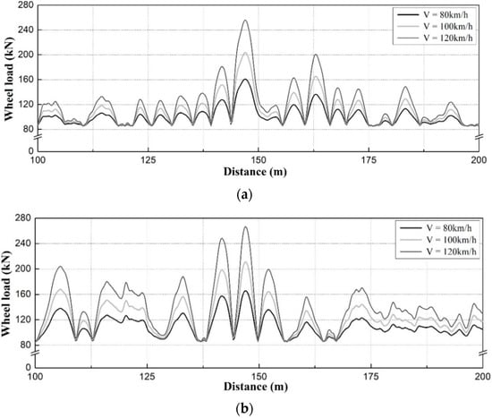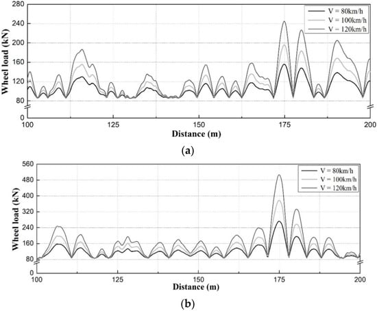 In the case of the right rail of the HSR T1 track, the maximum dynamic wheel load was ~251 kN when the train speed was 120 km/h in the maximum vertical profile section. This is ~2.13 times larger than the static wheel load. However, at a train speed of 80 km/h, the maximum dynamic wheel load was ~156 kN, which corresponds to an increase of ~95% compared with the static wheel load. In addition, the analyses showed that the dynamic wheel load in the left rail was ~95 kN larger at the train speed of 120 km/h than that at 80 km/h.