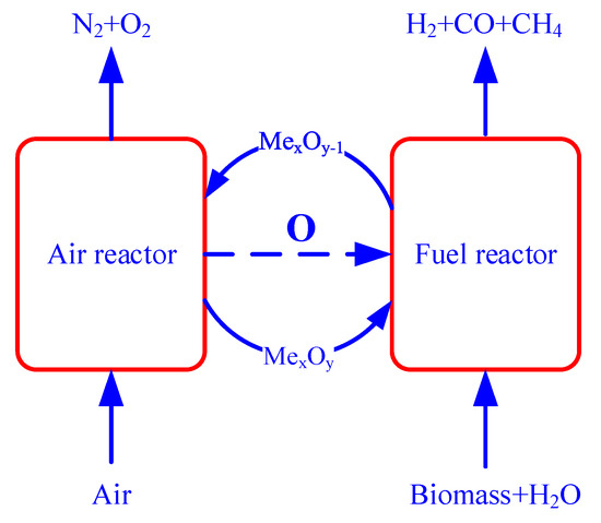 Chemical looping gasification (CLG) is a novel technology that uses lattice oxygen in an oxygen carrier to transfer oxygen from air to fuel to initiate biomass gasification. Figure 1 shows the schematic diagram of CLG performed by redox reaction that could be described by R1–R3. The oxygen carrier is oxidized by air in the air reactor. The oxidized oxygen carrier is used to initiate partial oxidation of biomass to produce syngas in the gasification reactor. The application of oxygen carriers is a key factor for the CLG process, and two main strategies are often used. Method 1 is to use traditional transition metal oxide with a low ratio of oxygen carrier to biomass to prevent excessive oxidation. Most of the research focused on materials of iron ore, Mn, Fe, and et al. [25,26,27,28]. Method 2 is to use an oxygen carrier with low oxidative activity to initiate partial oxidation rather than full oxidation. These kinds of oxygen carriers are often mixed oxides like ferrites or perovskites-based materials [29,30,31]. The mixed oxides oxygen carrier often has the advantages of different materials and even a synergy effect on fuel conversion. The application of these oxygen carriers in the biomass brings new opportunities yet tar removal is still one important issue during chemical looping biomass gasification.