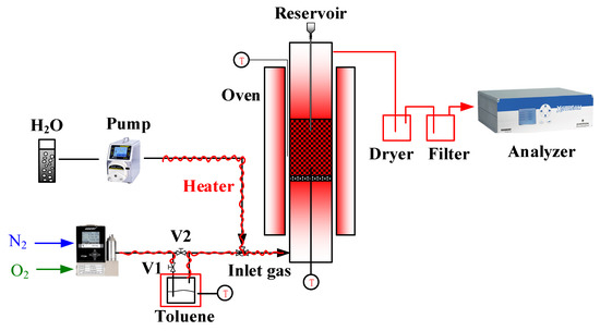The chemical looping conversion of toluene was carried out in a fixed bed system, as is shown in Figure 2. Simply, the system contains inlet gas, reaction bed, gas purification device, and gas analyzer. The flow of the inlet gas (N2 and O2) and H2O was accurately controlled by mass flow controllers and micro-pump, respectively. By switching the valve V1 and V2, the carrying gas N2 can be controlled to enter the air-tight toluene tank to bring toluene into the reactor. The toluene was placed in a water bath. The vapor-liquid equilibrium partial pressure of toluene was adjusted by adjusting the water bath temperature. Then, the toluene input flow can be quantitatively controlled by fixing the carrying gas flow. The reaction chamber was a quartz tube (i.d = 26 mm, L = 600 mm) with a porous distributor plate at the middle. The reaction chamber was heated with the temperature sensor installed 3 mm below the porous plate to monitor the reactor temperature. The outlet gas was introduced to a purification device for water and fine powder removal. Finally, the outlet gas compositions (CO, CO2, CH4, H2, and O2) were online analyzed with an X-stream analyzer. C1 mentioned in the investigation refers to CO, CO2, and CH4. For each test, the sample successively underwent toluene/N2/steam and air-regeneration. N2 sweeping was performed between each process.