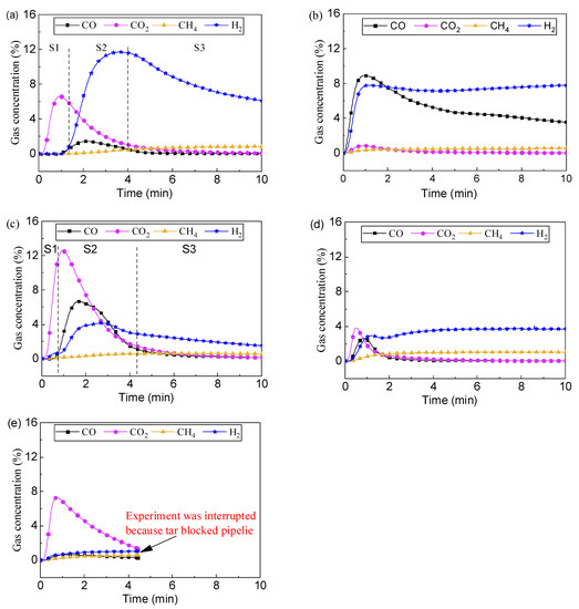 Gas concentration versus reaction time at 900 °C with typical oxygen carrier: (a) LaNi, (b) LaFe, (c) LaCo, (d) LaMn and (e) LaCu.