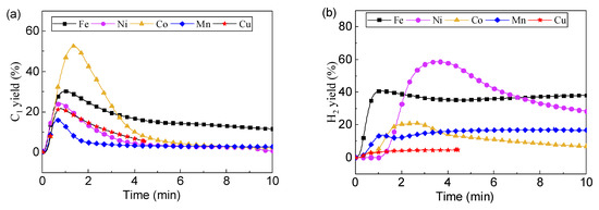 Figure 5 shows the C1 yield as a function of time using different oxygen carriers. C1 yield exhibited a first increasing and then decreasing trend with time. According to C1 yield peak, the reactivity decreased in the order of LaCo > LaFe > LaNi > LaCu > LaMn. However, Ni exhibited the best catalytic effect on hydrocarbons conversion, resulting in the highest H2 yield. Instead, after the consumption of lattice oxygen, the LaMn and LaCo exhibited lower catalysis reactivity for toluene conversion with H2 yield lower than 20%. The LaFe oxygen carrier exhibited a strong oxygen capacity, supporting partial oxidation. The reduced LaFe would also have a catalytic effect on toluene conversion, and H2 yield maintained at about 40%. The H2 yield decreased in the order of LaNi> LaFe > LaCo ≈ LaMn > LaCu.