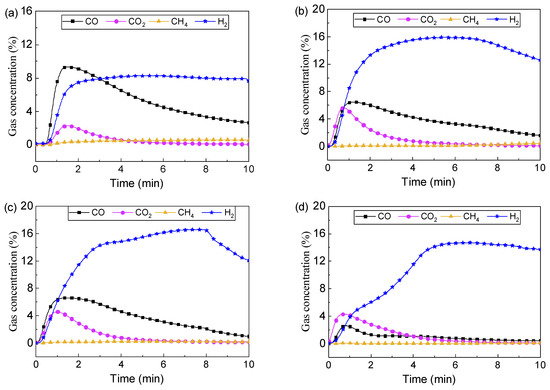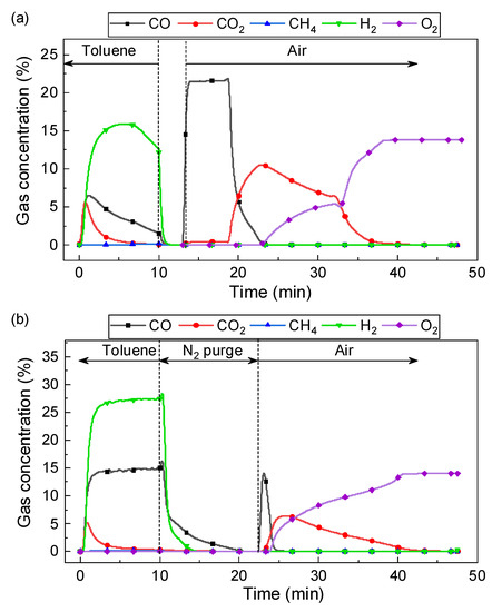 Steam addition would obviously change the reaction, and the gas evolution is shown in Figure 10b. Two important reactions occurred at the presence of steam, i.e., carbon gasification (C + H2O = CO + H2) and water gas shift reaction (CO + H2O = CO2 + H2). Simultaneously, the presence of steam also caused the reforming of toluene or the intermediate CnH2m + nH2O = nCO + (m+n)H2. They would efficiently prevent coke formation, promoting CO and H2 yield. Correspondingly, the concentration of CO and H2 maintained over 15% and 27%, respectively. Additionally, the reduced oxygen carrier LaFeO3-x would also be oxidized by water splitting (LaFeO3-x + xH2O=LaFeO3 + xH2) [38]. The reduction of oxygen carrier and water splitting would set up an inner circulation of LaFeO3 in the fuel reactor, and it greatly depended on the amount of steam. The inner loop of the oxygen carrier made it as a catalyst enhancing the yield of C1 and H2. A sharp CO2 peak was observed in the initial toluene step, and it was ascribed to the full oxidation effect of oxygen carriers, probably due to the presence of NiO.