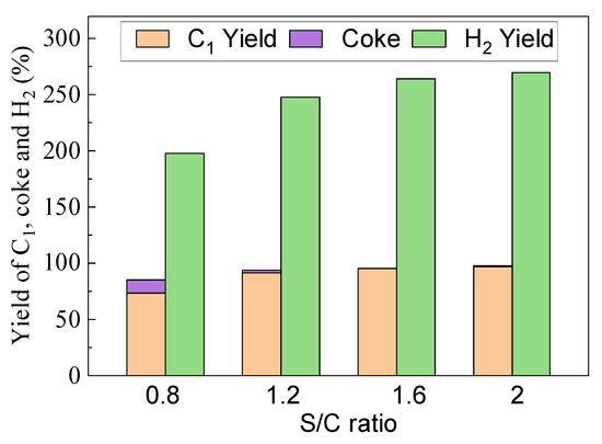 Effect of S/C ratio on the yield of C1, Coke and H2 at 900 °C using LaFe0.6Ni0.4.