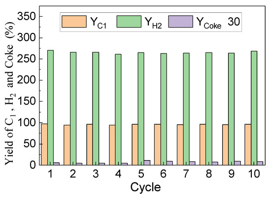 Reactivity stability is a key factor influencing the selection of oxygen carriers. 10 redox cycles of chemical looping toluene conversion were carried out to evaluate the cycle performance of LaFe0.6Ni0.4 at 900 °C and S/C = 1.6. Figure 14 shows the C1 yield, coke formation, and H2 yield during each cycle. With the cycle increasing, C1 yield and H2 yield firstly slightly decreased and then stabilized at about 95% and 264%. The coke yield maintained at a low value (<0.4%) during the whole cycle. A long time toluene duration (50 min) was also conducted, and C1 and H2 yield was also stable during the whole reaction stage. It indicates that that steam addition could restrain the carbon deposition and maintain an efficient toluene conversion into C1 and H2. Overall, the catalytic oxygen carrier exhibited a stable performance on toluene conversion with steam.