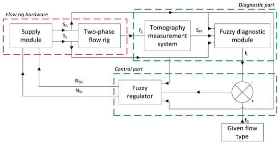 In Figure 1, the concept of the diagnostic control system for the experimental flow rig is depicted. The abbreviations used in the schema define the following signals: SG—set value of gas stream; SL—set value of liquid stream; fC—current flow type; SPT—process tomographic (i.e., 3D ECT) diagnostic signal; fI—identified flow type; fG—given flow type; NSG—a new set of the gas stream; and NSL—a new set of the liquid stream.