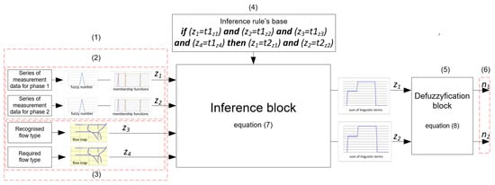 - The module for input signal fuzzification (1) that contains the first class (measurement data) (2) and second class (flow type) (3) signals fuzzification modules,
