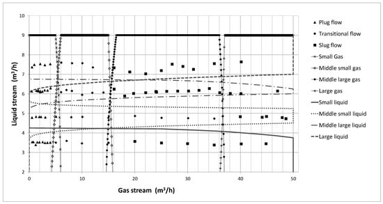 The regulator described in this article has been verified in the experimental flow rig []. Even if the mentioned rig allowed to obtain all basic flow types, the effective control range of the gas flow rate (0–50 m3/h) and the liquid flow rate (3–9 m3/h) allowed to manipulate the flow type between the plug, slug, and transitional (both plug and slug features) flow. The same pipeline was used for algorithm learning and validation (horizontal orientation, 60 mm diameter). The validation covered 30 independent test flows’ examinations by both the algorithm and a human expert in the field of flow dynamics. It is worth mentioning that the flows recognized and categorized by the human expert in most cases matched the corresponding types defined in the flow map. The only differences occurred when the slug flow was classified as a transitional flow. This miscarriage can be explained by the fact that there is an ambiguous border between areas where the basic flows have their specific features. It should be noted that even if the flow is classified as a basic type, it can still represent some additional features that can be included in the other basic flow type. The flow map for the research setup shown in Figure 6.
