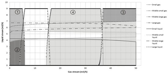 The first step of implementation is to determine the membership functions that can transform the domain of the measured signal (i.e., streams of gas and liquid) from crisp into fuzzy form. The most proper solution for this is to use function (3) with the acquisition time interval t equal to 15 s. The data acquisition frequency results from the period for a single complete measurement frame acquisition (about 1 Hz). Next, the trapezoidal-shape membership function must be determined to split the measurement range of gas and liquid streams into the values of the first-class linguistic variables (fuzzified gas stream and fuzzified liquid stream). These membership functions are used in premises and conclusions of the inference rules. To correctly determine the shape of the membership function, it is required to collect a series of test measurement data. This should be done in the presence of an expert who can recognize (classify) the two-phase flow types. The gas and liquid streams intensity was changing sequentially within the discrete measurement range of the pump and compressor to generate all possible flow types. Next, each stabilized state was evaluated. The expert, not being aware of the values of the current settings, assessed the flow type in the pipeline only based on observations. Then, all the flow types should be printed on the chart as depicted in Figure 3. All flows’ series, observed in the whole measurement range, are split into all flow type occurrence areas.