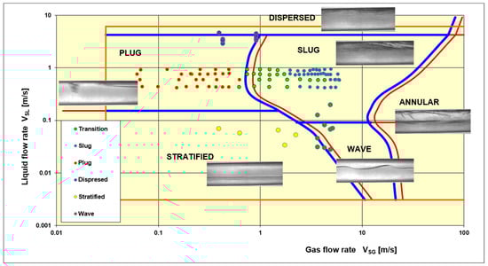 Prediction of the two-phase gas–liquid pipe flows features is one of the biggest challenges in such a mixture domain. It is even more challenging since multiple variables affect such prediction, including pipeline orientation, phases contribution, pipeline geometry, and even gravity (pushing the gas phase to the top of the pipeline in a horizontal direction). In the horizontal pipeline orientation, there are six basic flow types recognized []: plug, slug, dispersed, wavy, annular, and stratified. There are also additional hybrid flow types keeping the features of two or more basic types. Those can be defined as transitional flows; however, there is a need to add an additional description since there will be a slight difference between the transitional flow of slug and plug types and transitional flow of slug and wavy flows. The flow regimes with the transition borders are often reported on flow maps, showing how the different two-phase pipe flows can be generated by varying the inflow conditions. Figure 6 presents the map of flow types that have been identified (see details in Section 6) for the flow rig (see details in Section 3) during experiments in the current work. However, in Figure 6 the reader may be familiar with qualitative CCD images of the mentioned flow types. The observed structures of the gas–liquid mixture flow in the pipes of the vertical ascending movement are compatible with those presented by Nicklin and Davidson []. These structures have been used to classify these types of flow. Five basic flow patterns known as bubble flow, slug flow, foam flow, ring flow, and dispersion flow are characterized. When the two-phase mixture is flowing from the top to bottom (counter-flow), the flow structures were defined by Oschinowo and Charles []. It is worth noting that these structures relate to the two-phase mixtures of liquids with a high viscosity—not exceeding 100 mPa·s. For liquids with higher viscosity, the flow structures have to be defined differently [].
