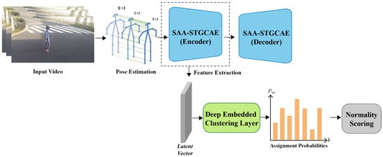 We propose a framework called SAA-STGCN for skeleton-based anomaly detection. The overall framework diagram of proposed method is illustrated in Figure 1. The suggested method focuses on human behavior detection while searching for anomaly detection. First, we directly perform the pose estimation algorithm to extract the human skeletons in each frame of the input video to generate spatiotemporal graphs (Section 3.1). This step makes the algorithm robust to complex backgrounds, lighting changes, human scales, and dynamic camera views. Next, we use the encoder part of SAA-STGCAE as a feature extractor to embed data and generate latent vectors (Section 3.2 and Section 3.3). The deep embedding clustering layer (Section 3.4) is used to softly assign latent vectors to the clusters, and then each sample is represented by the probability that it is assigned to k cluster. Later on, we use the Dirichlet process mixture model (Section 3.5) to evaluate a set of distribution parameters in the estimation stage and uses the fitted model to provide a score for each embedding sample. The normality score provided by the model is used to determine whether the action is normal or not.