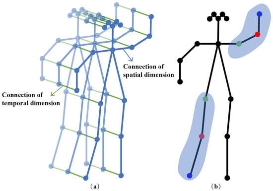 The original skeleton data that can be obtained from pretrained video pose estimation algorithms or motion capture devices are provided as a sequence of vectors. We define N as the number of joints in skeleton and T as the total number of frames. For each person, a spatiotemporal graph is established as , where is the set of all the joint nodes as the vertices of the graph, and E represents the set of all the edges describing natural connections in the human body structure and time as the edge of the graph. Further more, E consists of two subsets and , where represents the connection of any pair of joints in each frame t. represents the connection between each frame along the continuous time. Figure 2a shows an example of the constructed spatiotemporal graph, where the joints are represented as vertices and their natural connections in the human body are represented as spatial edges (the blue lines in the Figure 2a) and the corresponding between two adjacent frames are connected as temporal edges (the green lines in the Figure 2a).