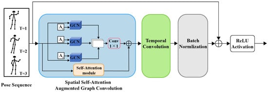 Spatial self-attention augmented graph convolution combines an improved ST-GCN block and a self-attention module to enhance spatial graph convolution.