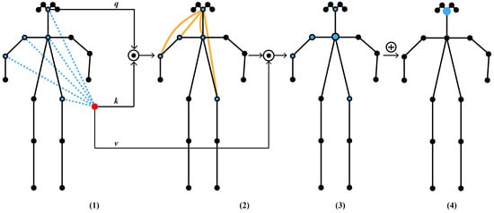 Self-attention of skeleton joints. (1) We calculate a query q a key k and a value vector v; (2) The query of the joint and the key of all the other joints is performed by dot product (⊙), and a weighted value is obtained to represent the strength of the connection between each pair of joints; (3) Each joint is scaled to a new node due to its correlation; (4) The new features are added (⊕) the weighted nodes together.