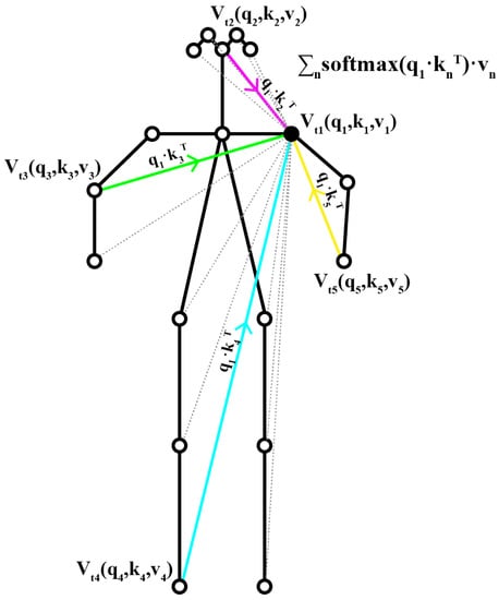 For each joint of the skeleton at time t, we first calculate the query vector , the key vector , and the value vector by applying trainable linear transformations to the joint features with parameters , , , shared by all nodes. Where is the number of input features and , , are the channel dimensions of the key vectors, the query vector and the value vector, respectively. Then, for each pair of body joints , the score , which represents the strength of the correlations between the two joints, is determined by , then it is used to weight each joint value , and a weighted sum is calculated to get a new embedding for joint , as shown in Equation (3).