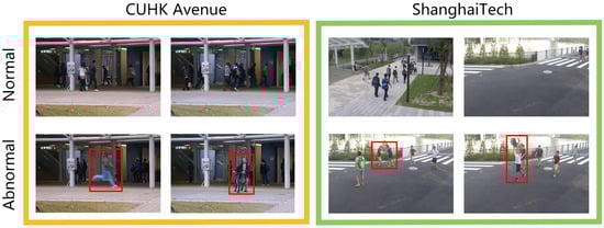 Some normal and abnormal event frames in CUHK Avenue and ShanghaiTech datasets. The abnormal event in the abnormal frame is displayed by the red box.