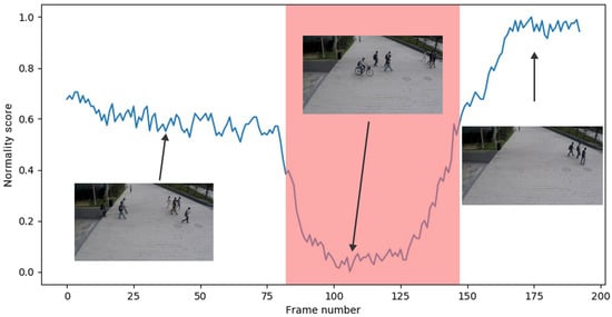 Normality Score of video clips from ShanghaiTech dataset. Regularity score is normalized to [0, 1] and the red areas in the figure represent anomalies.