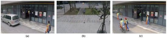 The failure cases on the ShanghaiTech Campus dataset. (a) Vehicle appears in the clip, which is not processed by our method; (b) Abnormal motion tracking skeleton may be lost when obstructed by obstacles; (c) False negative situation is a misjudgment by a slow cyclist.