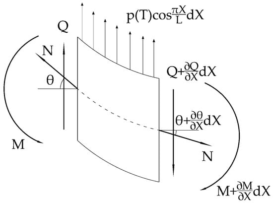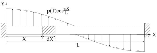 Considering a Euler-Bernoulli microbeam clamped at both ends with the length L, density ρ, uniform cross sectional area A, we investigate its excited vibration that usually appears in the MEMS. The X-axis is measured from the left side along the axial direction, while the Y-axis is measured from the bottom along the transverse direction, shown in Figure 1. The dynamic equilibrium chart for a microbeam element straying from the left side X, with length dX of the microbeam is illustrated in Figure 2, where is the external harmonic excitation at the time T and position X of unit length [35], M is the bending moment, N is the internal axial tension, Q is the shear force, and θ is the rotation angle with respect to X-axis of the microbeam.