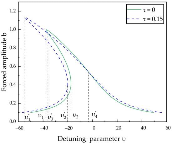 Figure 3 shows the relationship between the detuning parameter and the forced amplitude, in which is assumed. Note that the condition of in Figure 3 means zero dimensionless nonlocal parameter. Considering that the dimensionless nonlocal parameter is defined as the ratio of internal and external characteristic scale parameters, indicates that the external scale parameter (e.g., length of a beam) is much larger than the internal scale parameter (e.g., a lattice parameter), or the internal characteristic scale can be ignored in comparison with the corresponding external counterpart. On this condition, the size of the beam deviates from the micro-scale, and, as a result, a classical macrobeam and related results of classical vibration theory recover. However, the condition of represents that the values of internal and external characteristic scale parameters are comparable, as, notably, the magnitudes of internal and external characteristic scales are almost at the same level, namely, the size of the beam is at a micro-scale. For a microbeam, the external characteristic scale parameter is also in the order of microns/nanometers, the nonlocal parameter that measures the significant nonlocal effect should not be zero; that is the essence of the nonlocal theory. It is found that, when the absolute value of the detuning parameter becomes larger, the forced amplitude becomes smaller. Moreover, it is noted that, in the ranges of – and –, for the same detuning parameter, there are multiple stable-steady excited vibrations with different amplitudes. Therefore, a leap phenomenon exists in the two steady vibrations. It is observed that such a phenomenon also exists in the case of τ = 0.15, which indicates that some mechanisms at the micro-scale are identical to those at a macro-scale. For example, the leap phenomenon and related characteristics (e.g., a softening effect) exist in both the classical and nonlocal vibration models. However, some mechanisms are unique only at small-scales. Comparing the case of with , that is, without and with the nonlocal effect, we find that the nonlocal effect deflects the curve in Figure 3 where the relationship between forced amplitude and detuning parameter changes. In the range of –, the forced amplitude decreases when the nonlocal effect is taken into account, while beyond the range, the amplitude increases, which indicates that the nonlocal effect significantly affects the forced amplitude. Therefore, the nonlocal effect plays an indispensable role in the analysis of excited vibrations at the micro-scale.