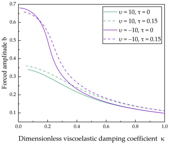 Figure 4 shows the relationship between the forced amplitude and the viscoelastic damping coefficient, in which is assumed. The softening effect is observed again where the forced amplitude gradually decreases with the increase of the viscoelastic damping coefficient, and the decreasing speed is slow at first, and then fast, and finally the curves tend to be flat. In addition, it has been observed that the dimensionless viscoelastic damping parameter has a significant influence on the nonlocal effect in the forced amplitude corresponding to the same detuning parameter. For the case of , the nonlocal effect increases the forced amplitude, and the difference becomes a little larger as increases and then gradually decreases when is more than 0.6. Corresponding to , the forced amplitude with a nonlocal effect () is smaller than that without the nonlocal effect () when is small, but with the increase of , the situation reverses, namely, the forced amplitude with nonlocal effect exceeds that without the nonlocal effect. Consequently, there is a coupling between the effects of the nonlocal parameter, viscoelastic damping, and detuning parameter on the forced amplitude.