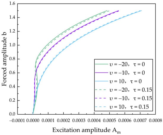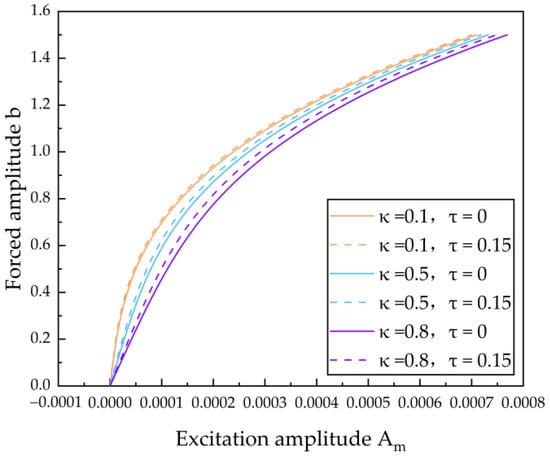 In Equation (26), assuming , we obtain the relations between the excitation amplitude and forced amplitude for different detuning parameters and nonlocal parameters, shown in Figure 5. Unlike the softening effect shown before, a hardening effect is observed. The results show that for the case of with a small excitation amplitude, there are multiple forced amplitudes corresponding to the same excitation amplitude, which is caused by the aforementioned leap phenomenon. On the other hand, while the excitation amplitude becomes larger, the forced amplitude increases with the increase in the excitation amplitude, but the rate of increase is smaller and smaller. In addition, the forced amplitude decreases with an increase in the detuning parameter. For the case of and , the forced amplitude with a nonlocal effect () is smaller than that without a nonlocal effect () or the classical counterpart. For the case of , the nonlocal result () is larger than the classical result (). This is because the main vibration function is deflected as a result of the existence of the nonlocal effect. Predictably, the larger the nonlocal parameter is, the larger the numerical result is.
