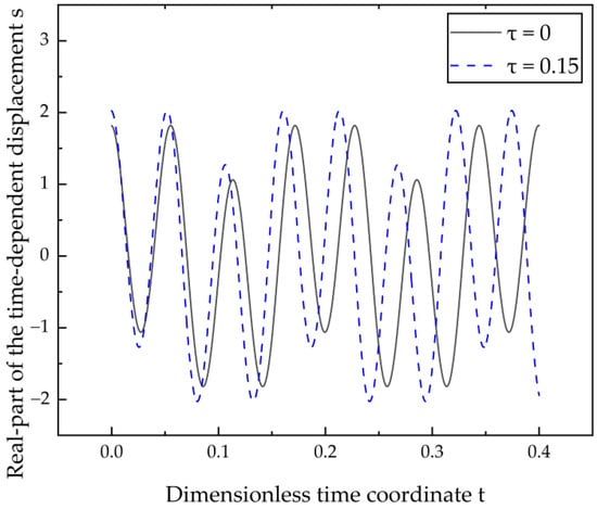 where . Relations between the real-part of the time-dependent displacement and dimensionless time coordinate given in Equation (28) can also be illustrated in Figure 7, where , and are assumed; it indicates that the nonlocal parameter causes the displacement to draft along the time coordinate axis. Consequently, the nonlocal hysteresis effect is found in the lateral excited vibration of a beam-like microstructure, which is mainly caused by the small-scale effect and viscoelastic effect. It is noted that the hysteresis effect has not been reported in the nonlocal free vibration of micro/nano-structures [6,7,8,9,10,11,12,13,14,20,21,22,23,24,25,26,27,28,29,30]. Resultingly, it is a special phenomenon in excited vibration. With a longer time, the nonlocal hysteresis effect seems more obvious.