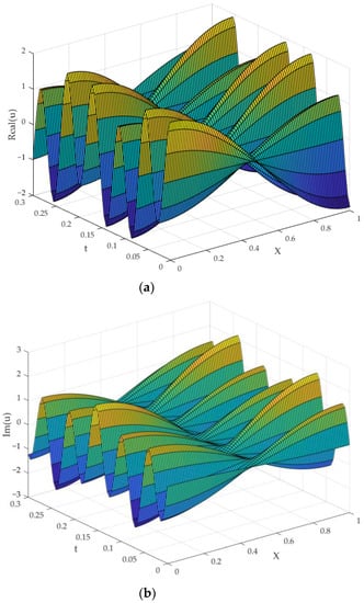 where , and the cubic nonlinearity is reflected again here. The evolvement of lateral displacement with respect to axial and time coordinates is given in Figure 8, where is adopted besides the assumptions in Figure 7. It clearly reveals the changes of lateral excited displacement with time and spatial variables, which are different from the results in the classical beam excited vibration, because of the nonlocal effect. For example, the displacement of the left and right halves of the microbeam is not symmetrical. Additionally, the peak values of the real-part displacement (or imaginary-part) are different at different moments. Since most of the numerical results in this paper are shown in dimensionless form, they cannot be directly compared with the classical excited vibration results. However, from the qualitative trend, many conclusions reported herein are consistent with the classical excited vibration, because of the existence of external harmonic excitation and internal viscoelasticity. Hence, the present numerical results can be verified qualitatively. In addition, some phenomena, unique to the excited vibration of microbeams, are found in the numerical results due to the existence of nonlocality.