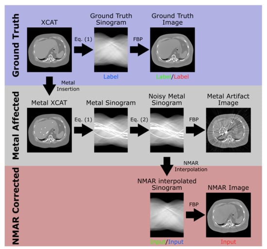 The photon production, attenuation, and detection is described by a Poisson distribution. Electronic noise of the detector is simulated with a Gaussian distribution with a mean value of zero and [33,34]. A subsequent FBP results in an image containing metal artifacts. As input for the training of our networks we do not use this artifact image; instead, we use data pre-corrected with the NMAR algorithm as shown in the third row of Figure 3. The prior image used for the normalization in NMAR is obtained by segmentation of soft tissue and bone in a LIMAR image [11,12].