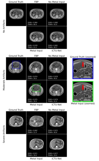 Finally, we train the iCTU-Net with the MSE loss. For no artifacts and moderate artifacts, the SSIM and PSNR evaluation metrics for the SSIM and MSE losses are similar. However, the SSIM metric for the MSE loss is considerably worse for severe artifacts and the reconstructions of the MSE iCTU-Net in Figure 4 look grainy. Thus, the network with U-net post-processing layers combined with SSIM loss performs best. Only this network configuration is referred to as iCTU-Net in this work.