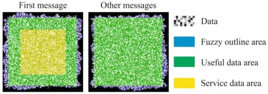 Since modern data content is measured in gigabytes, MCDDC by default is a sequence of messages. We discarded all patterns associated with positioning and orientation and combined all service elements in one block to maximize useful data area. The service block was put into the center of the first message, with the following messages containing only encoded data. The structure of MCDDC’s messages is presented in Figure 1.