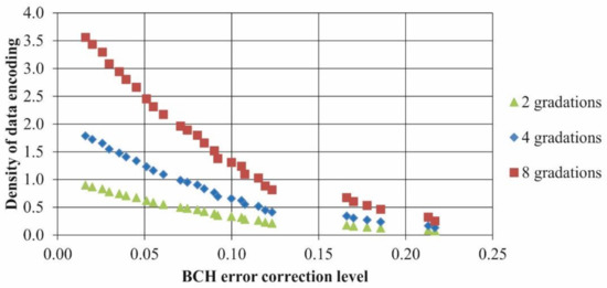 To determine container experimental error correction level, we used noise pollution simulation with “salt and pepper” kind of noise and “one module—one pixel” container representation when single QR code module corresponds to a single pixel in an image [48]. The low results of QR code (the only one available value of 0.7%) are due to its unsuitability for such representation. In experiments with coherent illumination, one module of QR code is usually represented by a block of several dozens of pixels, but it led to a very low density of data encoding. Due to the bit format of BCH, MCDDC can successfully operate in this representation.