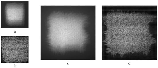 MCDDCs with 128 × 128 elements and 254 × 254 elements with four gray levels and with the input error correction level of 21.7% were used in the experiments (see Figure 8). The size of the fuzzy outline area for containers with 128 × 128 elements is 10% of the linear size of the container on each side, and for containers with 254 × 254 elements—25% of the linear size of the container on each side. Encryption was carried out with two encryption keys with 128 × 128 elements with densities that were characterized by normalized average energy (NAE) 0.0005 and 0.001 and with two gray levels. The encryption keys with different NAE values and corresponding encoding DOEs are shown in Figure 9. The size of the encoding DOEs was 4000 × 2464 elements.