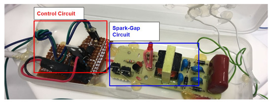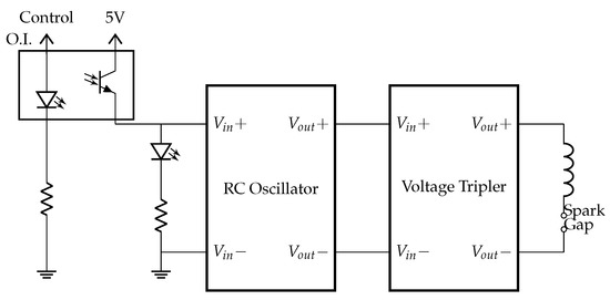 Since the circuit involves very high DC voltage at its output, we took a precautionary measure and controlled its operation using an optical isolator (OI). That way, the spark gap circuit works only when a control signal is given, which allows the current flow at the output of the isolator. The entire circuit is shown in Figure 1. The left block is the OI unit, which, when a control signal is applied, allows current to flow to the EM fault injector and start the charge–discharge cycle, and turns on the LED to signal the circuit is activated. The oscillator block, which is a joule thief circuit, then generates an AC square wave, which is the input to the voltage multiplier block that charges the capacitor at the output until a high enough voltage causes the gap to be bridged and a peak current to flow through the coil. The entire circuit, including the spark gap generator, fits into a small plastic case, as shown in Figure 2.