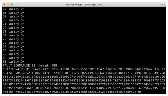Output of the Raspberry Pi while running a repetitive RSA-CRT-Sign operation from the PyCrypto library. For testing purposes, the program prints every second a "sanity" message indicating the device is still alive and has not crashed.