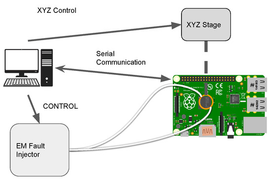 In order to learn which areas of the chip are most susceptible to EMFIs, we created the following experiment setup: a central PC was connected to the DUT and was capable of starting and stopping the RSA-CRT program; we recall that the PC acts as a regular user-land attacker but is still able to make the privileged program perform an RSA-CRT operation by using its exposed API. The PC was connected to the EM fault injector as well, to activate its control circuit, that is, to activate it, causing it to start producing EM pulses. Lastly, the PC was connected to an XYZ stage, which controlled the location of the Raspberry Pi and was able to move it in precise increments. This setup is described in Figure 4.