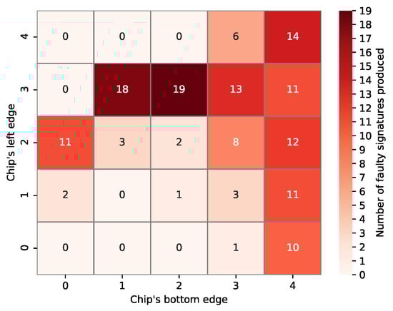Heat map of vulnerable points after running the experiment 19 times, using a 5 × 5 grid. Each cell value represents the number of times a successful faulty signature was returned from the program while the DUT itself continued execution and did not crash.