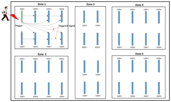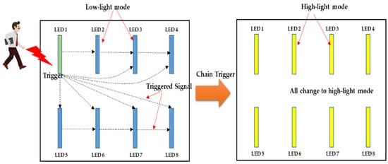 The user can set the zone to which the LED lights are installed according to their needs. When the LED lights are set to the same zone, they will act in synchronization. As can be seen in Figure 3, when someone approaches zone 1, LED 1 immediately transmits the trigger signal to LED 2–LED 8. There are two ways to receive it: the first is to receive the triggered signal sent by LED 1 directly, and the other is to receive it from other LED lights that received the triggered signal earlier. Taking LED 8 as an example, it can receive the triggered signal sent by LED 1. It can also receive the triggered signal turned from LED 7 (where the signal arrives first). After receiving the trigger signal of LED 1 (Master), LED 2–LED 8 (Slave) will also be immediately illuminated. LED 1–LED 8 will also be changed to the high-light mode simultaneously. Note that the LED lights in different zones will not be triggered because of the various channel settings.