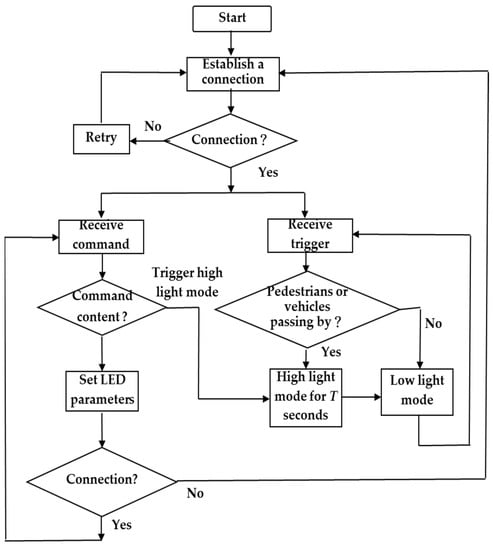 When the proposed system starts to receive externally triggered signals, it will run in the low-light mode if no pedestrian/vehicle is detected and will continue to receive triggered signals. As long as pedestrians or cars are passing by, they will immediately turn into the high-light mode. It lasts for T seconds (the user can set the parameter T through the IoT module, and its default value is 30 s), and it will automatically switch to low-light mode after T seconds.