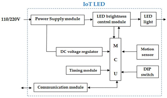 Figure 6 shows a hardware block diagram of the proposed IoT-based intelligent LED light. The power supply module adopts 110/220 V universal voltage. The central processing unit (MCU) [36] executes according to the parameter value sent by the communication module. Moreover, the MCU sends a control command to the LED brightness control module to determine the power ratio and intensity of the LED high-/low-light duration. The communication module is a Wi-Fi 2.4 GHz wireless transmission module responsible for data transmission with the cloud and transmission between the proposed IoT-based intelligent LED lights.