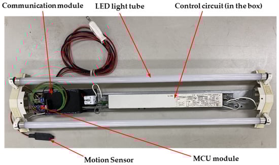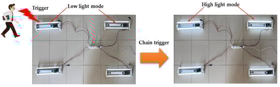 When no one is passing by, the proposed IoT-based intelligent LED lights in the same zone will operate in “low-light mode” simultaneously. When any one of the proposed IoT-based intelligent LED lights in this zone detects a person passing by (as shown in Figure 8), the wireless transmission module transmits the message to other IoT-based intelligent LED lights in the same zone and adjusts the brightness to the “high-light mode”; at the same time, instead of sequentially lighting up the proposed IoT-based intelligent LED lights.