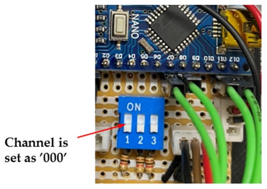 The communication module in Figure 7 adopts a Wi-Fi 2.4 GHz wireless transmission module. This module manages the data transmission to the cloud and transmits signals among the proposed IoT-based intelligent LED lights. The transmission method between the proposed IoT-based intelligent LED lights is only the proposed IoT-based intelligent LED lights set to the same channel and will be sent or received from the other proposed IoT-based intelligent LED lights. For example, we suppose the proposed Master IoT-based intelligent LED light channel in Figure 9 is set to “000” (dip switch is set to “000”). In this case, the set parameters transmit to other channels and put them to “000” for the proposed slave IoT-based intelligent LED lights via wireless communication. As for the proposed IoT-based intelligent LED lights of different channels, this message will not be received. Please note that the MAC address is not used to facilitate the user in setting the area number arbitrarily because it is more convenient and direct to select the channel via a DIP switch. Using DIP switches instead of MAC addresses for group planning is to facilitate responses to future equipment failures. Field maintenance personnel can quickly replace faulty equipment by setting the same DIP-switch channel to reduce the chance of technicians coming to the scene. If the MAC address is used for group planning, IT staff should be asked to add and delete related MAC address groups every time the faulty device is replaced.