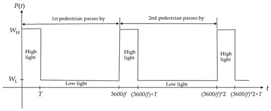 We illustrate how to calculate each proposed LED’s light energy consumed per hour according to the power changes in the high-light mode and the low-light mode, as shown in Figure 11. P(t) is used to describe the power change between the high-light mode and the low-light mode. Other parameters are described, as can be seen in Table 6.