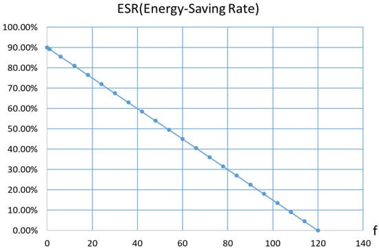 Table 7 indicates that 90.00% of the maximum ESR occurs when f = 0 (indicating that no one passes by within 1 h). The same is true for other Dpy, Mpy, and Cpy values. The ESR increases as the T value increases. With a linear decline, when f = 120 (means that people continuously pass by within 1 h), the ESR drops to 0%, but this is unlikely to happen because induction lights are usually installed in places where fewer people pass by. Figure 12 shows a graph of the relationship between the ESR and f-value.