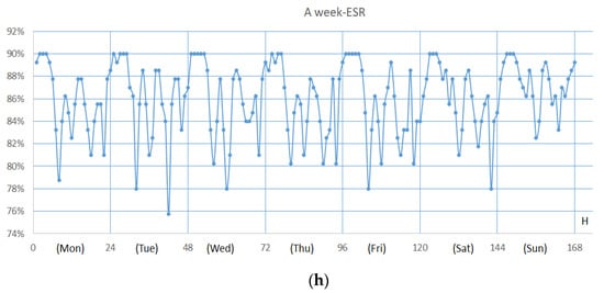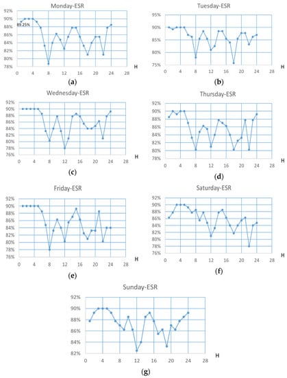 Figure 13 shows the measured hourly (H) ESR change chart of a parking lot. After recording the actual number of people per hour and referring to Table 4, we can obtain the ESR for that hour and draw the daily ESR change chart. Taking the first hour of Monday as an example, with f = 1, after referring to Table 5, we can see that the ESR is 89.25%. Some results from Figure 13a–h can be observed as follows: