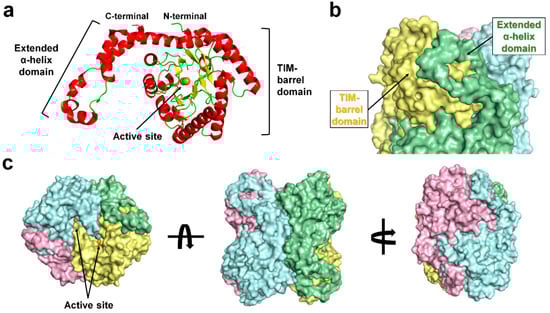 Structurally, GI consists of a TIM barrel-like domain and an extended α-helix domain (Figure 3A,B) which are assembled into a functional tetramer (Figure 3C) [21]. The substrate-binding pocket is formed by two protomers and the GI active site is located on the TIM-barrel fold (Figure 3C). The GI exists as a tetramer with 222 crystallographic symmetry [30] and includes four active sites for substrate isomerization.