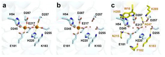 Three different metal-binding states in the active site of the GI from Streptomyces rubiginosus (SruGI). (a) Two-metal-binding mode (PDB code: 6IRK), (b) one-metal-binding mode (PDB code: 5Y4I), and (c) metal-free state of SruGI (PDB code: 7CJP).