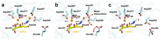 Proposed mechanism of xylitol-induced release of metal at the M2 site of GI. (a) Xylitol-bound state of GI. (b) Rearrangement of xylitol-binding residues. (c) Release of metal ion from M2 site of GI.